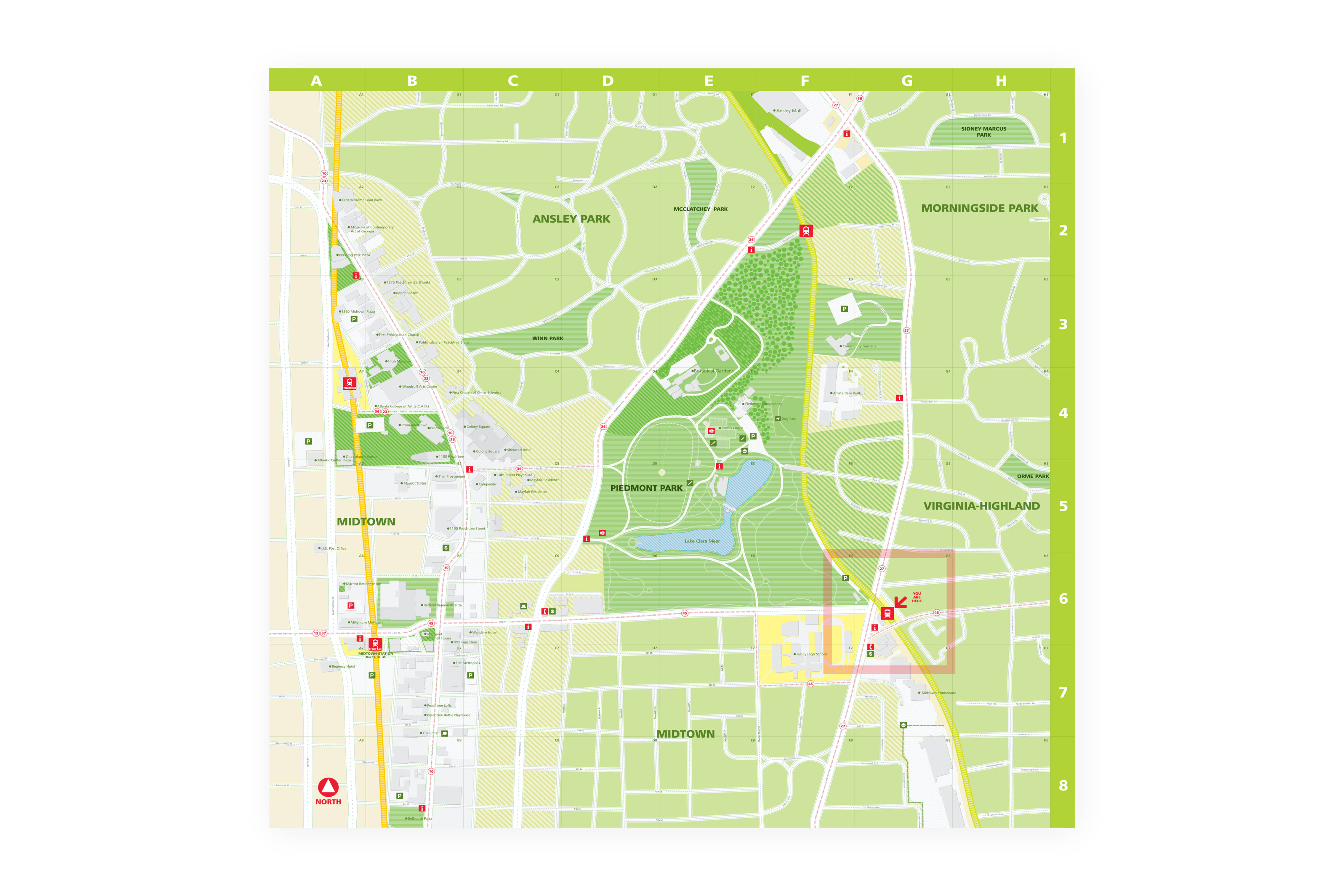 A primary goal of the wayfinding program was to educate residents on the walkability of Atlanta. A blueprint for a series of maps was created to showcase the walkable areas of Atlanta. The area on the maps represents a distance that would take an average person 30 minutes to walk.