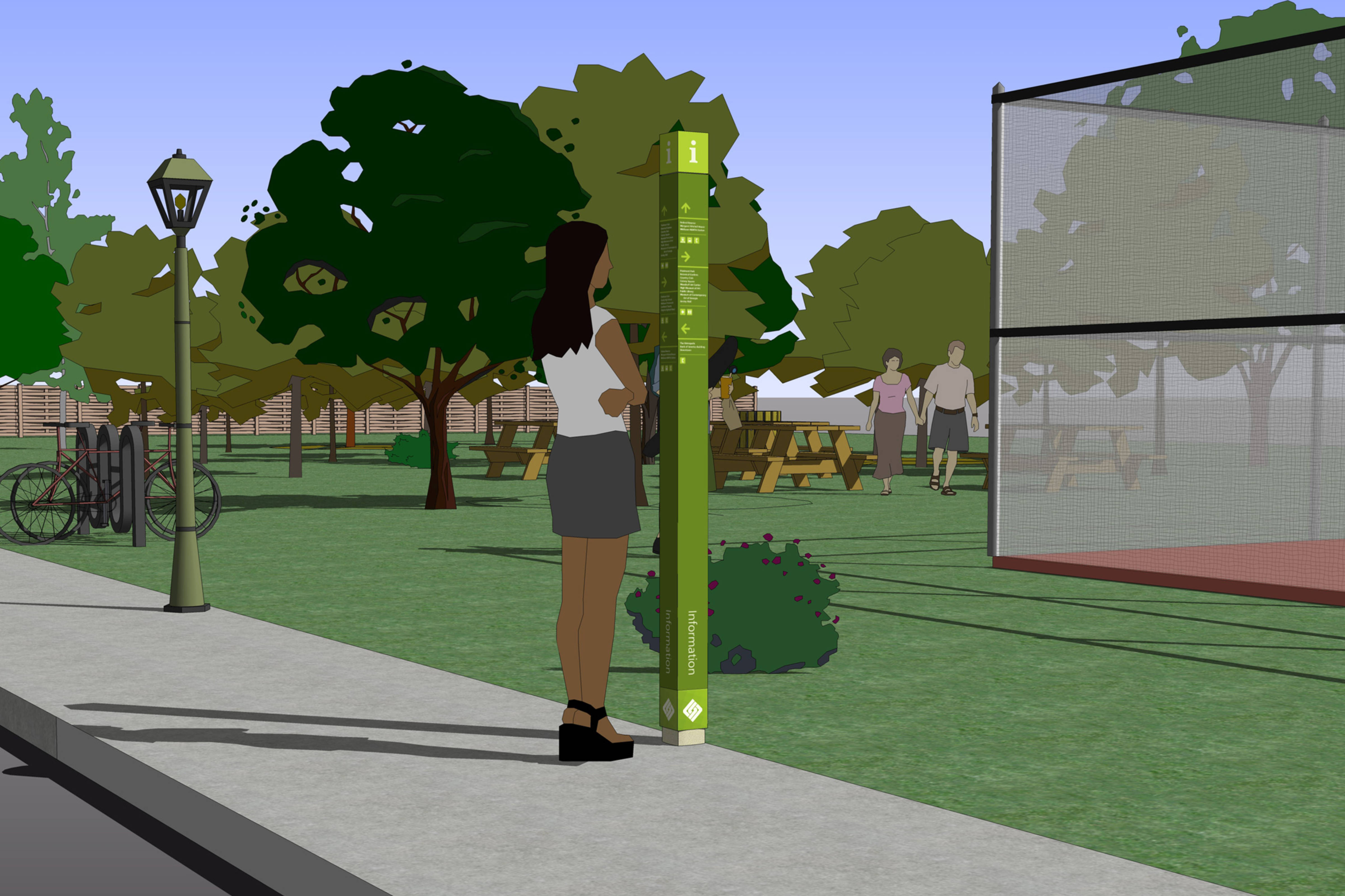 One last additional sign post was created to help users find their way. A series of tall directional posts were used to provide wayfinding assistance to areas where the map kiosks were unlikely to be placed.