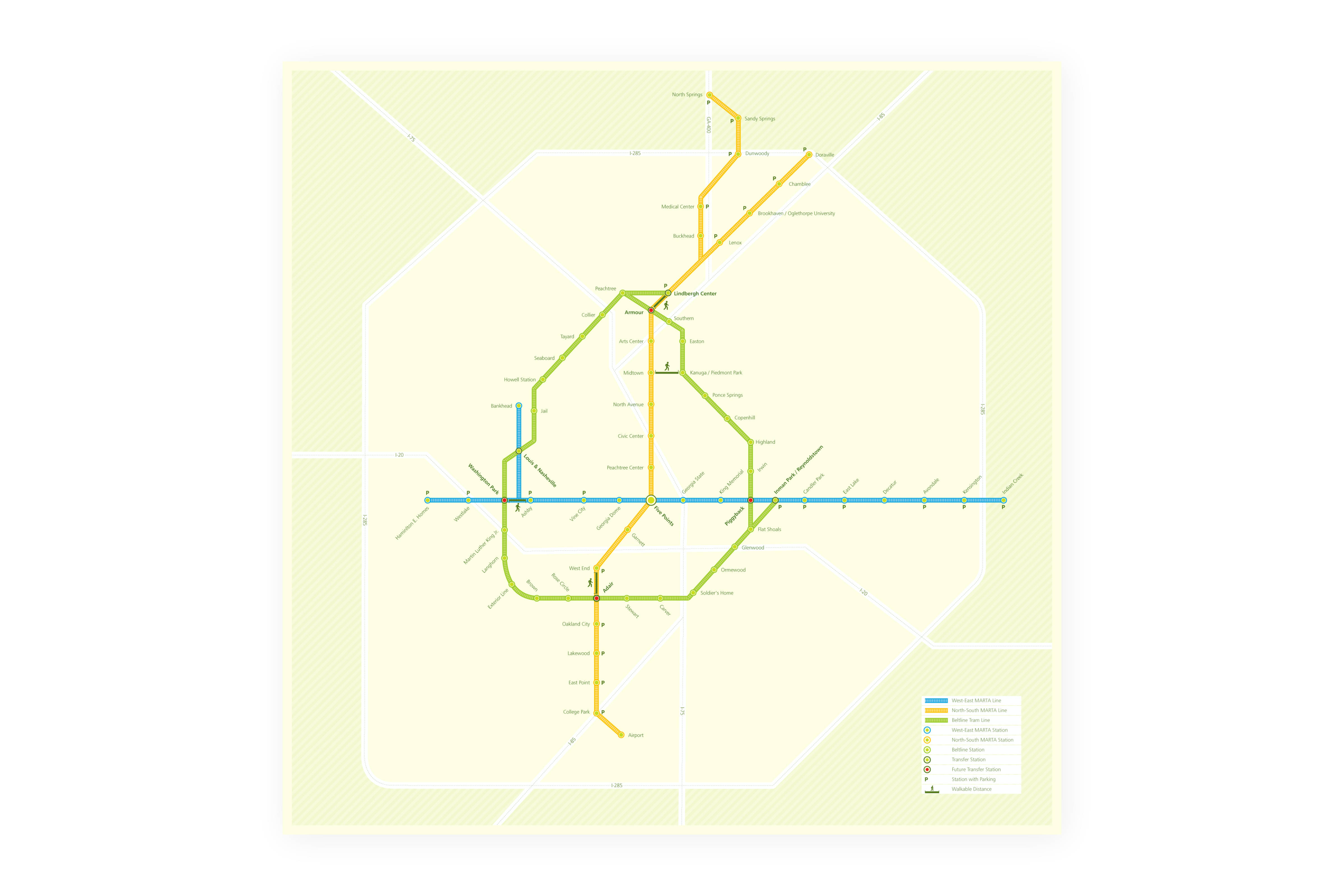 A key device for connecting the Beltline to the MARTA was to create unified map that shows how both transit systems can work seamlessly. To maintain familiarity with MARTA customers, the shape of the original blue and orange routes remained similar, while the Beltline loop was added. The proportional size of central Atlanta was increased to give greater emphasis on inner city transit.