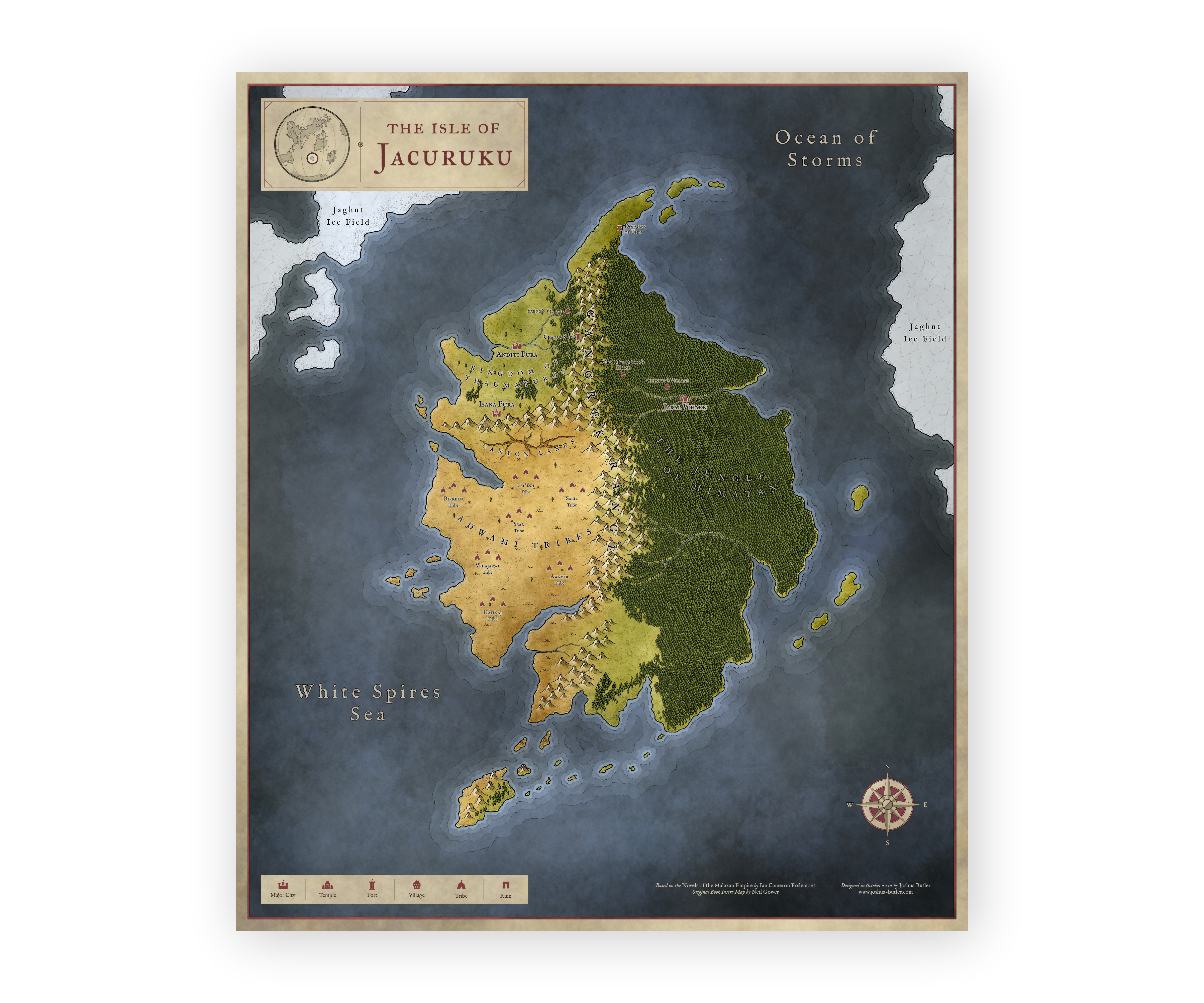 The continent of Jacuruku was a small island-continent located south-west of Stratem and Korel, south of Quon Tali and Seven Cities and east of Lether. It was divided in two by the Gangrek Range, with deserts lying to the west and thick jungles to the east.