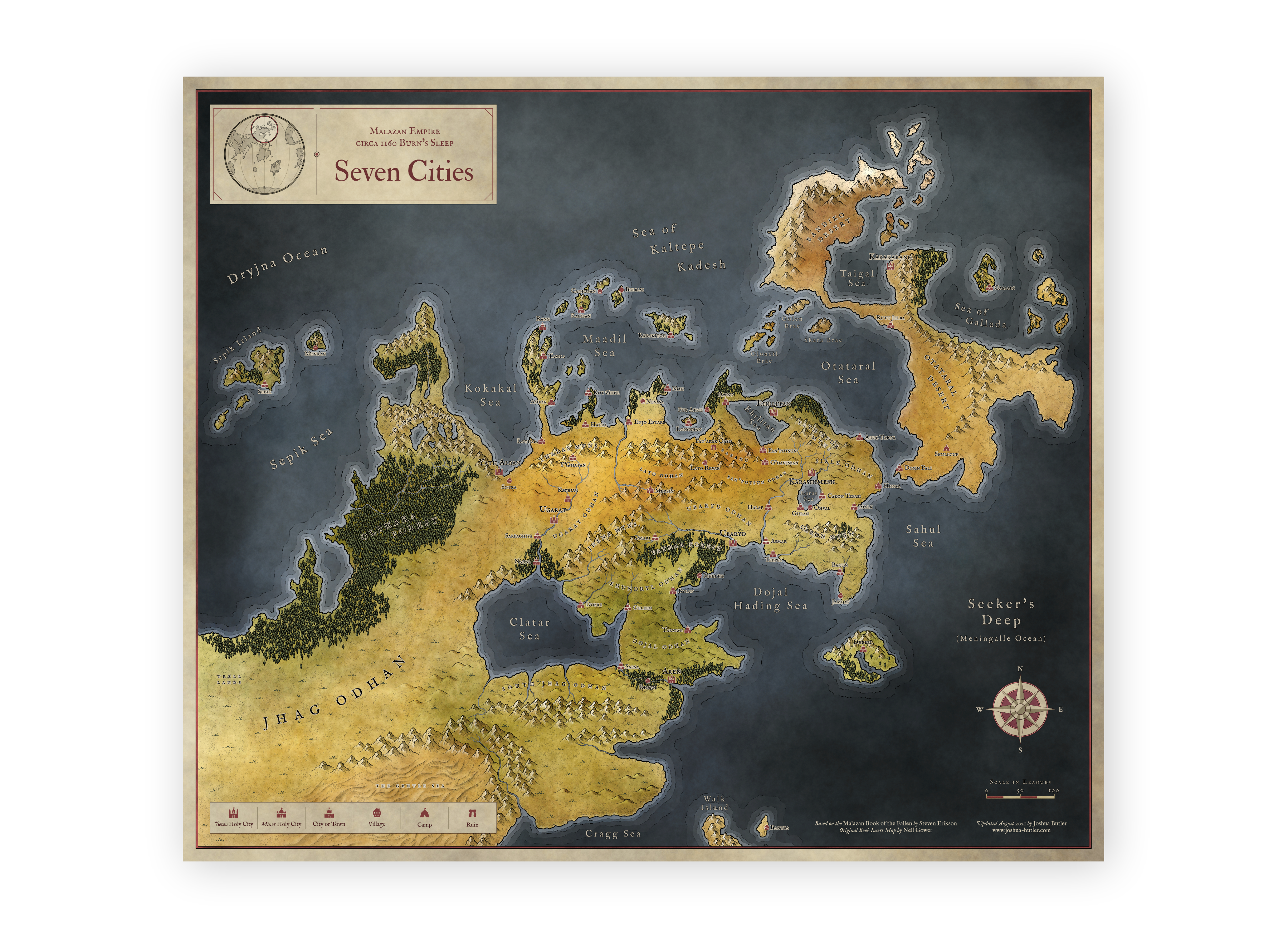 Seven Cities was a sub-continent north of Quon Tali and west of Genabackis that had been conquered by the Malazan Empire. It was an ancient land, built upon the ruins of countless cities dating back to the First Empire. Hot, dry, and largely desert, its sands obscured forgotten pathways, hoarded power, and soaked up sorcery. Every foot of the land had been walked by Ascendants. To the northwest it was bounded by the Sepik Sea and the Dryjhna Ocean. To the north, by the Kokakal, Maadil, Talgai, Otataral, and Bandiko Seas, as well as the Sea of Kaltepe Kadesh. To the east were the Sea of Gallada, the Sahul and Dojal Hading Seas, and Seeker’s Deep. To the south lay the Cragg Sea and Quon Tali. The Clatar Sea was contained within the south-central portion of the continent itself. Whiskeyjack commented that Mock’s Hold was about 3000 leagues from Seven Cities. Seven Cities supplied the front lines on Genabackis. Ganoes Paran thought that the natives of Seven Cities had a predisposition for causing trouble and attributed the problems of the Genabackis Campaign to the pre-dominance of Seven Cities natives in the Malazan 2nd, 5th, and 6th Armies.