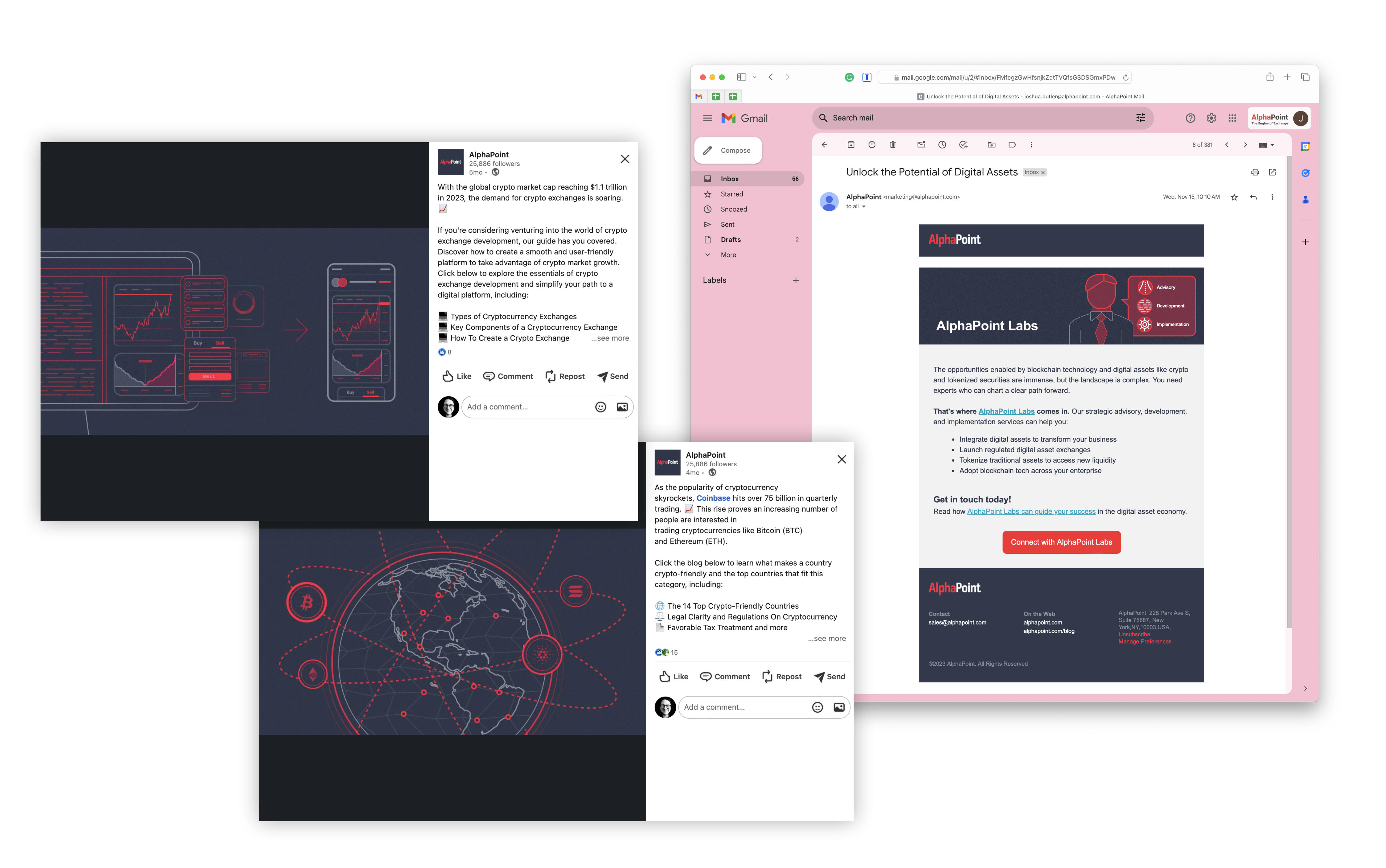 Outcome: AlphaPoint’s website is currently under development. However, with its marketing touchpoints, the adoption of the minimalist visual style complemented by illustrations has significantly differentiated and enhanced its social presence on platforms like LinkedIn and through direct emails. This strategic approach has led to a marked increase in user engagement, with a large 84% rise in overall clicks and a 37% increase in unique impressions.