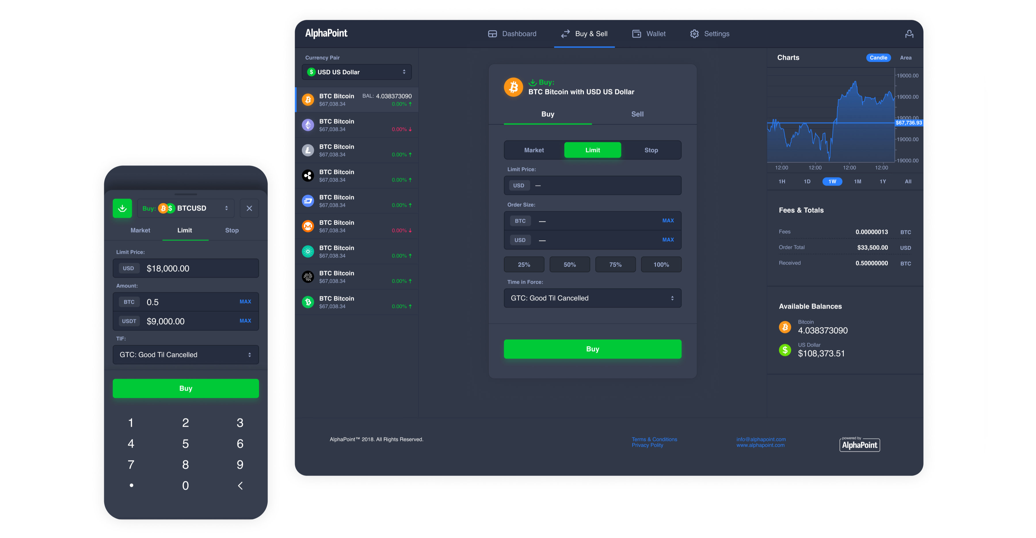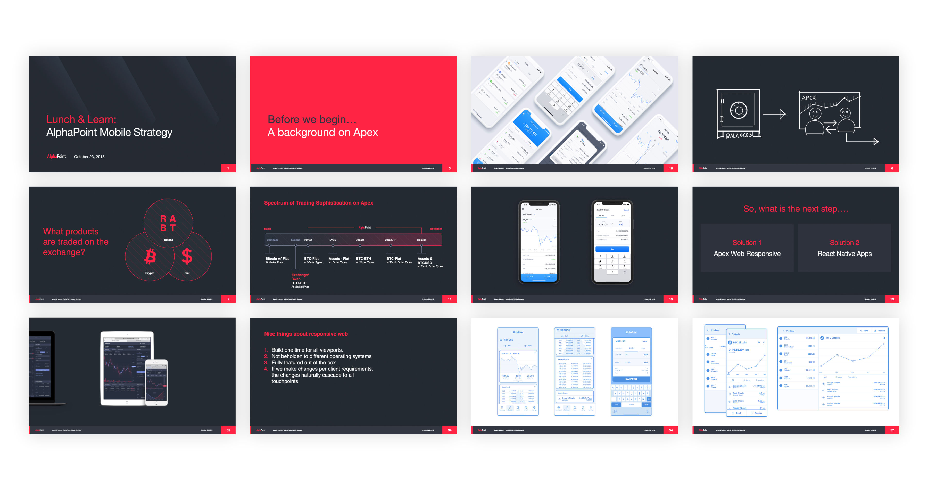 Context and Challenge: In 2017, AlphaPoint’s flagship product, APEX, a white-label crypto exchange platform, was limited to a browser-based solution. Shortly after I joined the company, we created a mobile companion app, which was developed quickly in native code for Android and iOS, and was feature-poor with light customization options. This restricted AlphaPoint’s ability to offer a bespoke mobile experience to its customers, hindering their business goals and ability to adapt to the rapidly evolving crypto market.