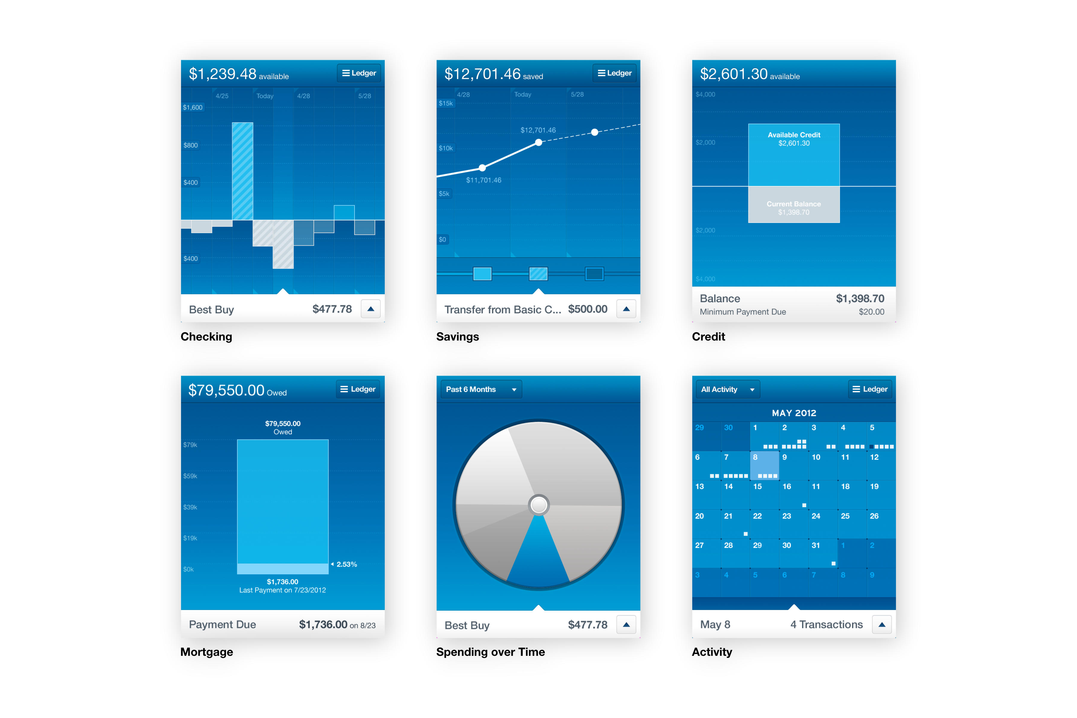 - A sample set of designs that showcase the flow from viewing all accounts, to looking at the account overview, and finally a look at the transaction detail.