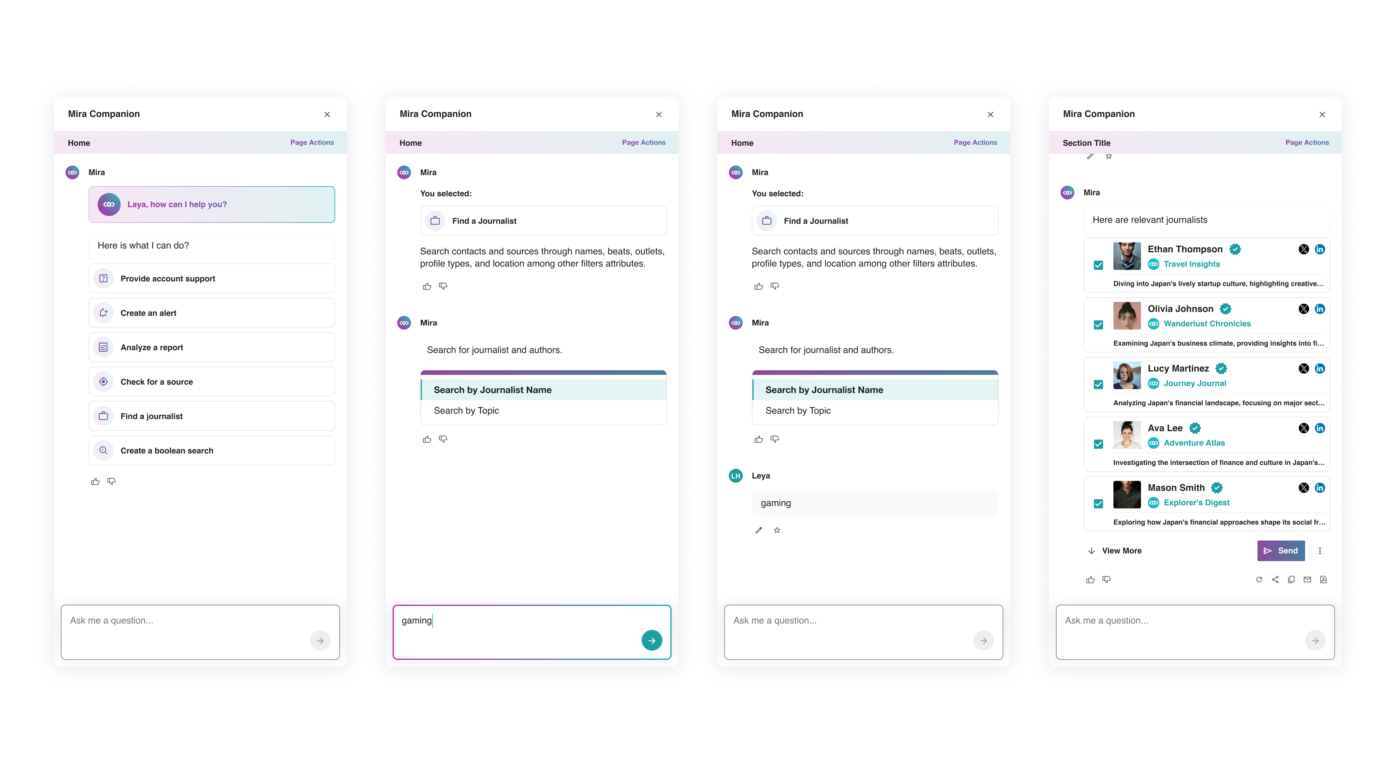 The Mira Companion is contextually aware, serving up user prompts that directly relate to the content that is being displayed, sometime producing documents, sometimes providing follow-on insights within the companion itself