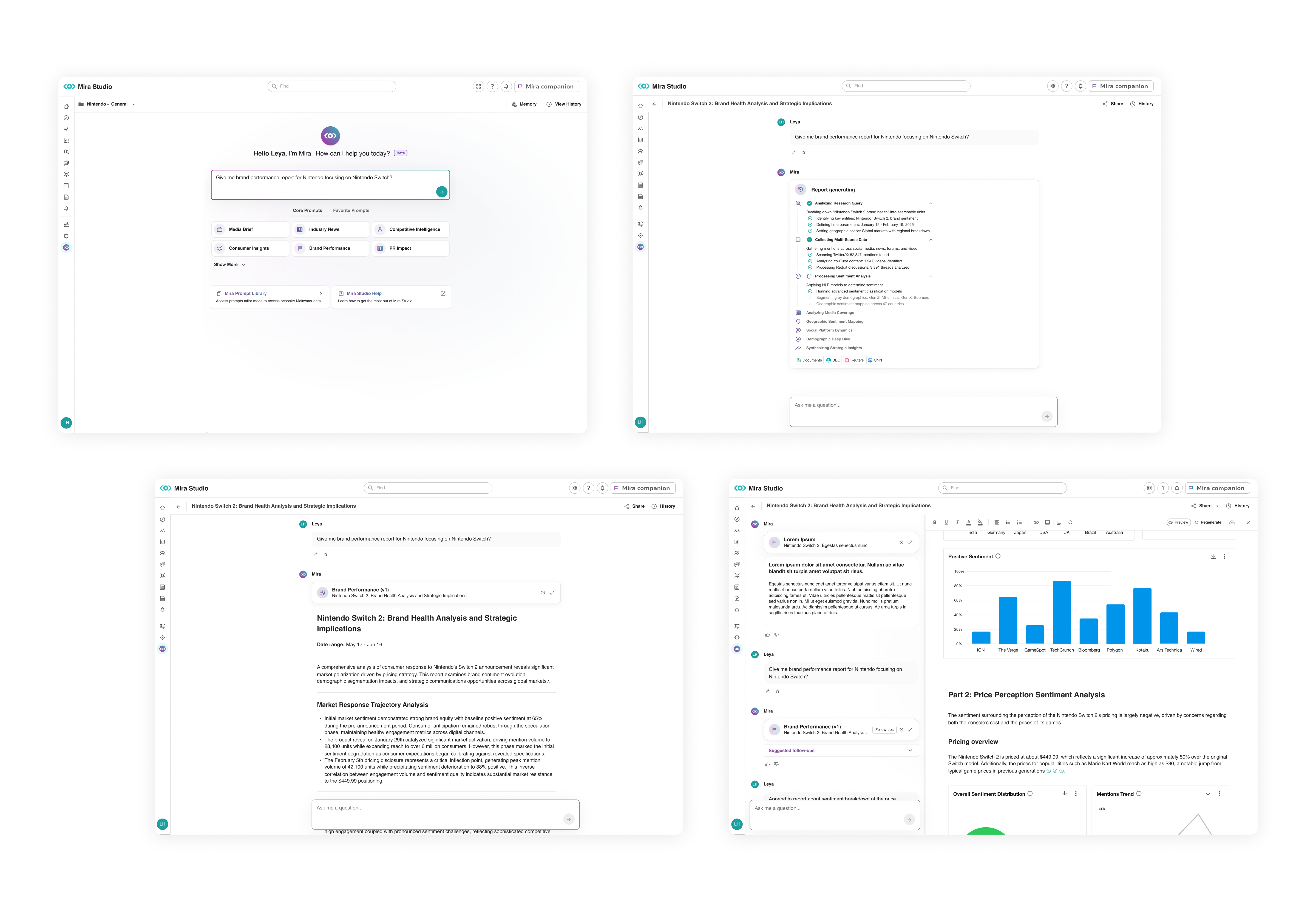 Approach: Our quest was to forge Meltwater’s first AI MVP—an intelligent agent that would open the gates of media intelligence to everyone. I led the design of Mira, envisioning not just a chatbot, but a true teammate. We wanted natural conversation to replace the tedious workflows of the past. By building a Prompt Library, Templated Reports, and an ever-present Companion, we ensured that both newcomers and veterans could wield the power of the platform with ease.