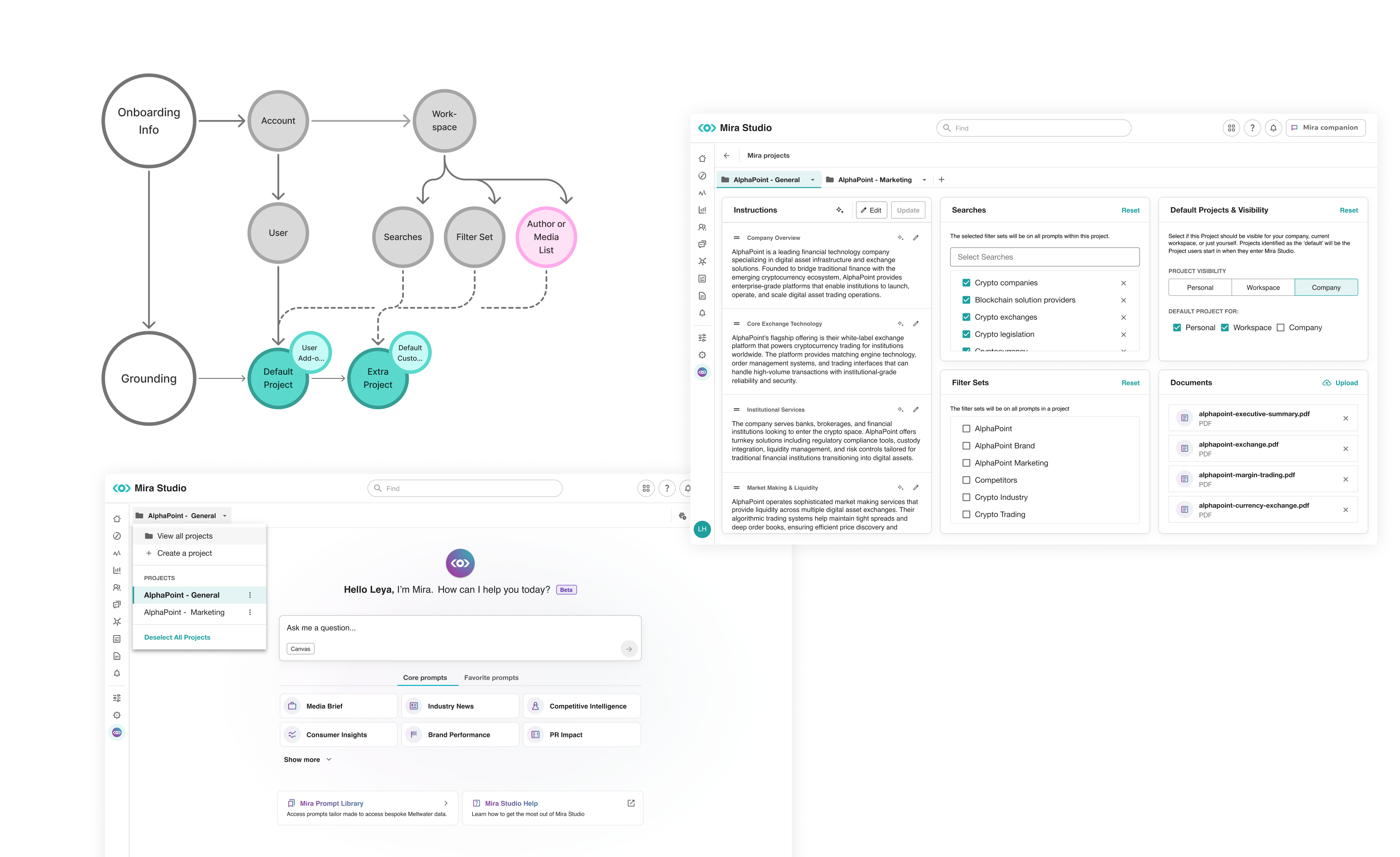 When I began the Mira initiative, my first step was to establish a clear understanding of our starting point. I carefully mapped out each of the existing AI-powered features and components that were already live within Meltwater’s platform. With this foundation in place, I then incorporated the Mira Studio core section into the map, creating a comprehensive visualization that showed how our new AI capabilities would complement and enhance what we’d already built.